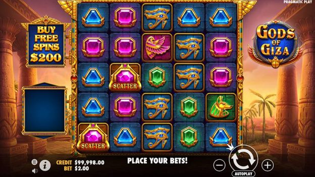 Gods of Giza adalah game dari Pragmatic Play yang hadir dengan 5reel, 20payline dan merupakan tema Mesir Kuno. Diproduksi oleh Pragmatic Play, game ini menawarkan kemenangan berjenjang ditambah dua fitur bonus. RTPnya hingga 96,01%. Slot ini membawa anda ke makam suci Mesir Kuno dan alam para dewa yang mahakuasa. Giza sendiri terkenal di dunia sebagai lokasi beberapa monumen paling mengesankan, termasuk makam dan kuil kerajaan Mesir kuno, Piramida Agung Giza, dan Sphinx Agung. Namun tema ini juga sedikit tidak original dalam hal slot. Ada beberapa fitur menarik dan fitur Free Spins yang cukup banyak di sisi positifnya.